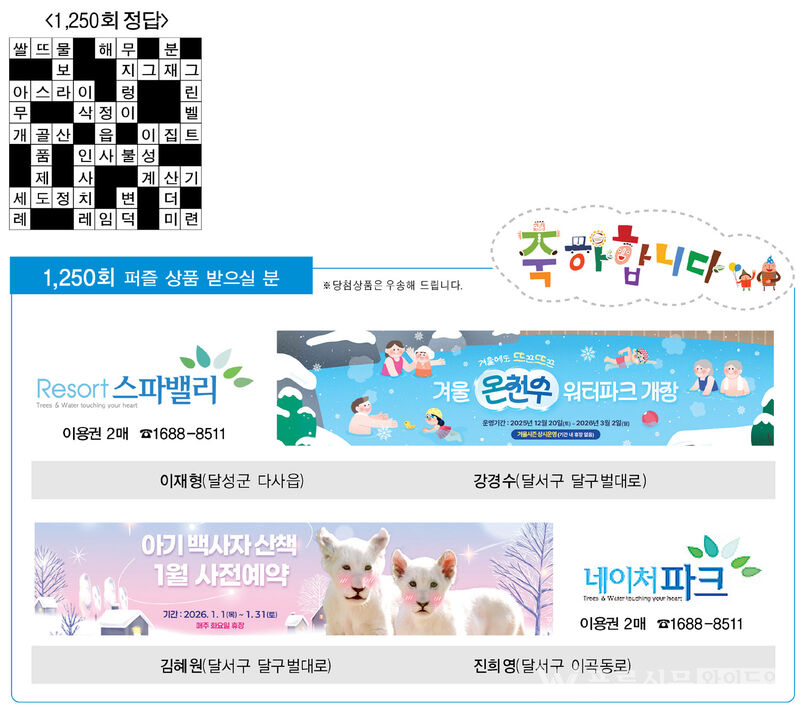 ♣ ‘가족과 함께 풀어보세요’정답을 아시는 분은 본사 편집부로 보내주시기 바랍니다. 2026년 1월 13일(화)까지 도착된 엽서 중에서 추첨을 통해 상품을 드립니다. ※주소를 정확히 기재해 주십시오. 당첨상품을 우송해 드립니다.