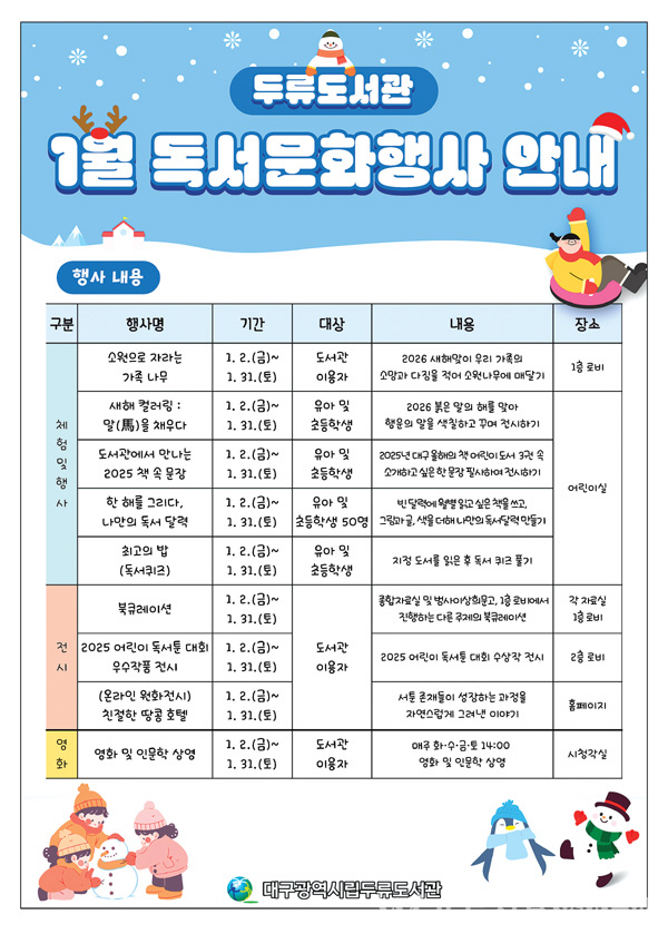 대구두류도서관은 1월 2일(금)부터 가족과 지역 주민을 대상으로 ‘1월 독서문화행사’를 운영한다. 체험·전시·영화 상영 등 도서관 곳곳에서 참여할 수 있는 다양한 프로그램이 마련됐다.
