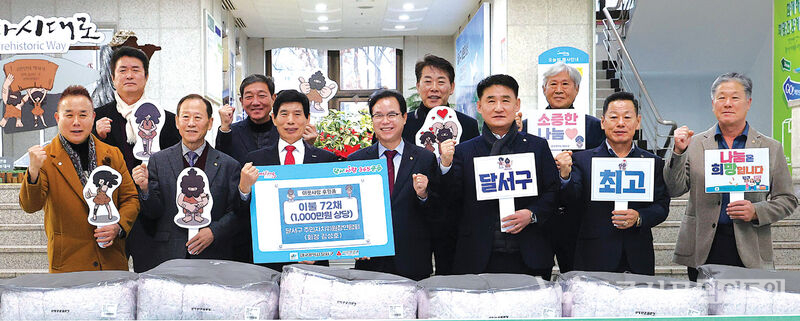 달서구 주민자치위원장연합회(회장 김성호)는 지난해 12월 29일(월) 취약계층 지원을 위해 이불 72채(약 1,000만 원)를 달서구청에 전달했다.