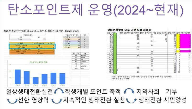 학교는 2019년부터 생태·환경 중심 교육과정을 운영해 왔으며, 2024년부터는 ‘교내 탄소포인트제’를 도입해 운영 중이다. 이 제도는 급식 잔반 줄이기와 우유갑 분리배출 실적을 개인 및 학급별 포인트로 적립하는 방식으로, 학생들의 실천을 수치화해 지속적인 참여를 유도한다.