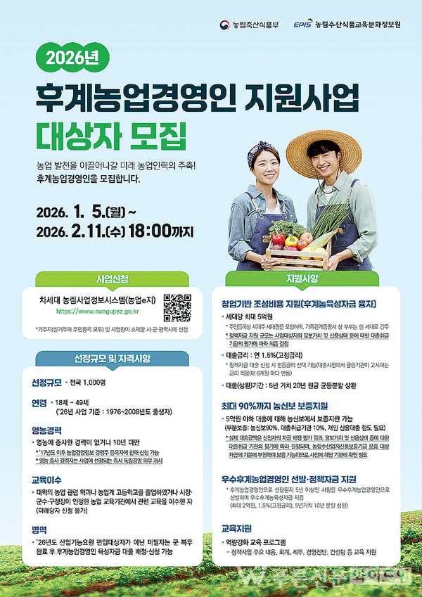 대구광역시농업기술센터는 미래 농업 인력 육성을 위해 2026년도 후계농업경영인 선발 신청을 받는다.