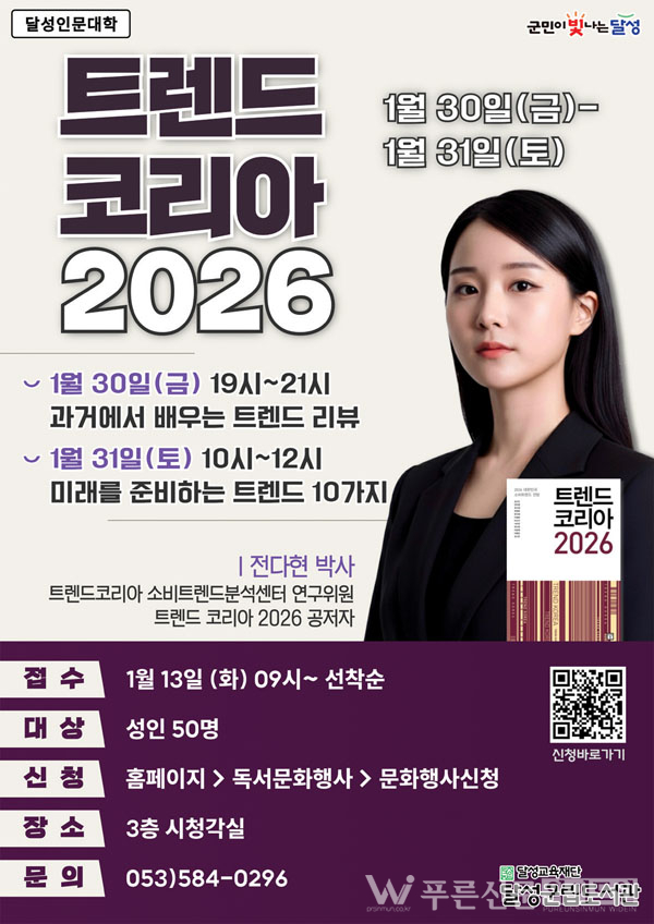 달성군립도서관이 2026년 한 해 동안 지역 주민을 위한 ‘명사초청특강’을 진행한다. 이번 특강은 문학, 역사, 경제, 심리학, 물리학 등 다양한 분야 전문가들이 참여하며, 총 11회로 구성된다.