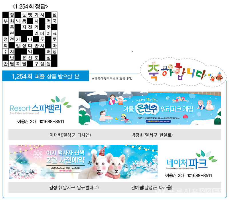 ♣ ‘가족과 함께 풀어보세요’정답을 아시는 분은 본사 편집부로 보내주시기 바랍니다. 2월 10일(화)까지 도착된 엽서 중에서 추첨을 통해 상품을 드립니다. ※주소를 정확히 기재해 주십시오. 당첨상품을 우송해 드립니다.