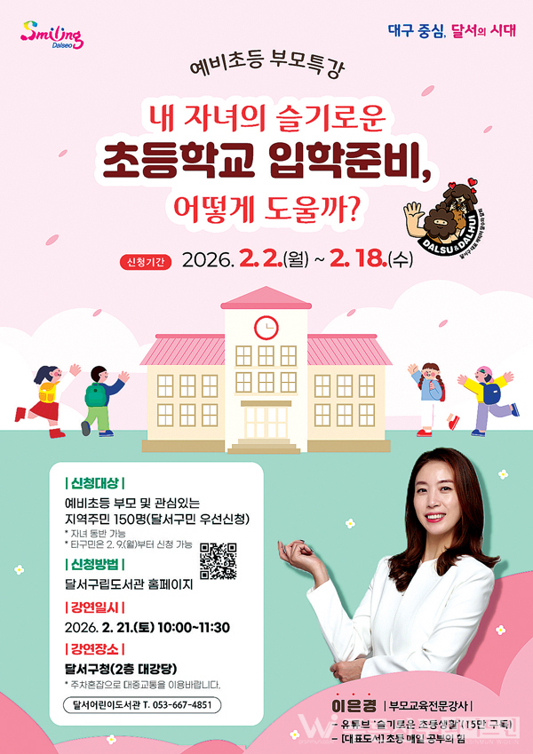 강연은 2월 21일(토) 오전 10시 달서구청 2층 대강당에서 진행되며, 지역 내 예비 학부모와 관심 있는 주민 150명을 대상으로 선착순 접수를 받는다.