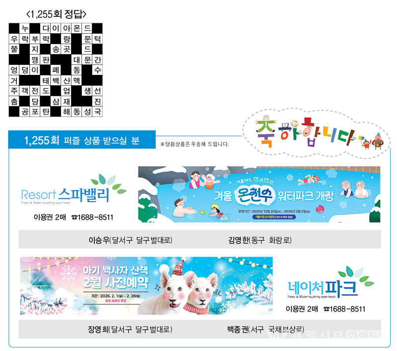 ♣ ‘가족과 함께 풀어보세요’정답을 아시는 분은 본사 편집부로 보내주시기 바랍니다. 2월 24일(화)까지 도착된 엽서 중에서 추첨을 통해 상품을 드립니다. ※주소를 정확히 기재해 주십시오. 당첨상품을 우송해 드립니다.