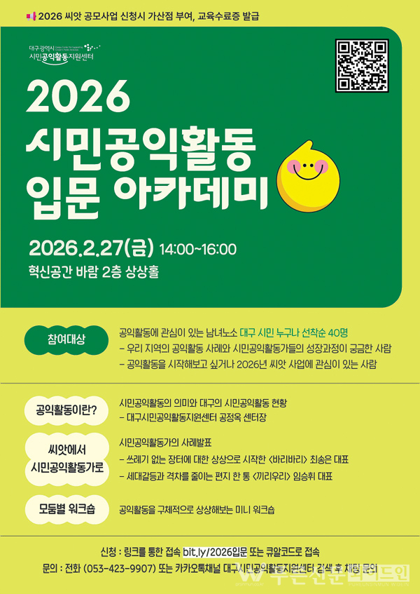 대구시는 시민들이 공익활동을 쉽게 배우고 실천할 수 있도록 ‘2026 시민공익활동 입문 아카데미’를 운영한다.
