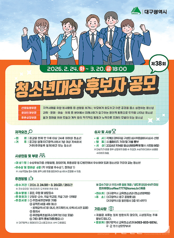 대구광역시는 지역 청소년들의 모범적인 성장 사례를 발굴·격려하기 위해 3월 20일(금)까지 ‘2026년 제38회 대구광역시 청소년대상’ 후보자를 공개 모집한다.