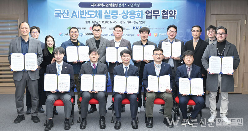 대구시가 지난 12일(목) 시청 산격청사에서 경북대학교 등 대학·공공기관·팹리스 기업과 국산 AI 반도체 실증 및 상용화 협력을 위한 업무협약을 체결했다. 이번 협약에는 에이직랜드를 비롯한 팹리스 기업과 전문기관이 참여해 지역 주력산업과 연계한 실증을 추진한다.