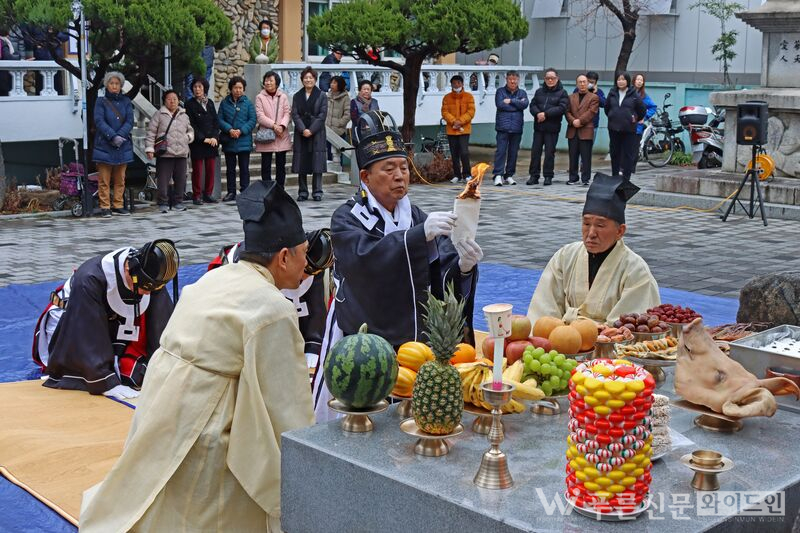 감삼동 대동제(당산제)에 참석한 제관들이 주민들의 염원을 담은 소지를 태워 올리며 다복을 기원하고 있다. [사진=이원선기자]