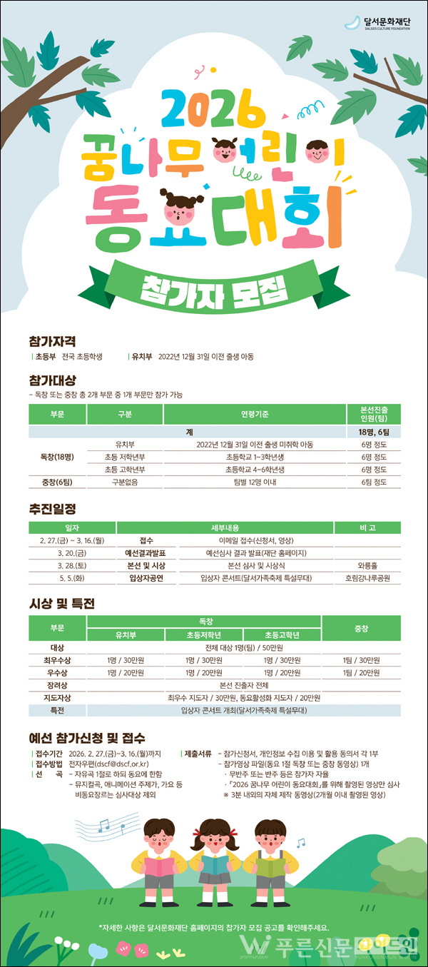 달서문화재단이 어린이의 맑은 목소리로 꿈과 희망을 전하는 ‘2026 꿈나무 어린이 동요대회’를 열고 오는 3월 16일(월)까지 참가자를 모집한다.