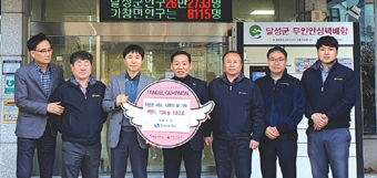 평화산업사는 지난 8일 논공읍 행정복지센터를 방문해 이웃돕기성금 400만 원을 관내 어려운 이웃들을 위해 써 달라며 기탁했다. 박만기 대표는 “작은 정성이지만 앞으로도 이웃사랑을 꾸준하게 실천하는 기업이 되겠다”고 말했다. 이원한 논공읍장은 “경기가 어려운 가운데서도 어려운 이웃과 정을 나누고자 하는 평화산업사 박만기 대표님께 감사의 인사를 전하며, 기탁한 귀중한 성금은 우리 주변의 어려운 이웃을 위해 소중하게 사용하겠다”고 말했다. 한편 이날 전달받은 성금은 논공읍 지역의 저소득 소외계층 40가구의 따뜻한 설 명절나기를 위해 지원될 예정이다.