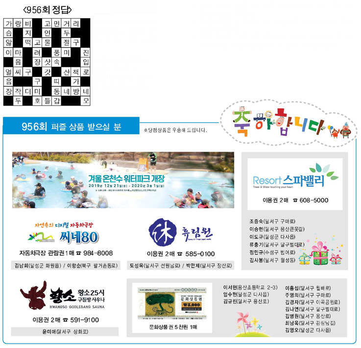 ♣ ‘가족과 함께 풀어보세요’정답을 아시는 분은 본사 편집부로 보내주시기 바랍니다. 2월 4일까지 도착된 엽서 중에서 추첨을 통해 상품을 드립니다. 주소를 정확히 기재해 주십시오. 당첨상품을 우송해 드립니다.