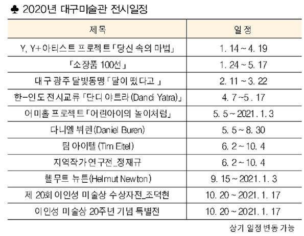 2020년 대구미술관의 전시 방향성은 소장품 대규모 전시, 동시대 유럽 작가 소개, Y, Y+ 아티스트 프로젝트 등 장기 프로젝트 성과 중간 점검, 이인성 미술상 20주년 기념, 대외적인 기관 협력 등이다.
