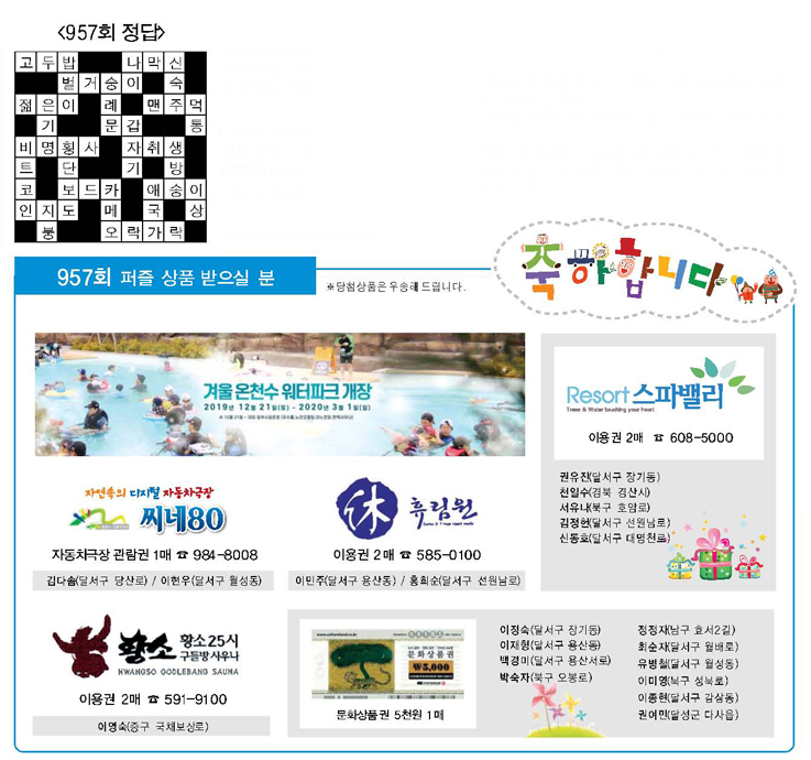 ♣ ‘가족과 함께 풀어보세요’정답을 아시는 분은 본사 편집부로 보내주시기 바랍니다. 2월 11일까지 도착된 엽서 중에서 추첨을 통해 상품을 드립니다. 주소를 정확히 기재해 주십시오. 당첨상품을 우송해 드립니다.