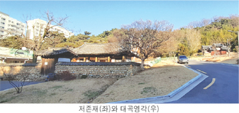 예로부터 대곡동과 진천동에 다수의 경주최씨들이 세거해왔다. 이들은 경주최씨 대곡 입향조인 매영헌(梅永軒) 최효열(崔孝烈·1563-1622) 선생의 후손들이다. 선생은 본래 경주사람인데 임진왜란 때 왜적의 손에 부인과 자식 그리고 고향땅 잃었다. 이에 ‘고향을 떠나다’란 제목의 시 한 수를 남기고 대대로 살아온 경주 땅을 떠나 지금의 대구 대곡동 소방산 아래에 새 터를 잡았다. 이곳에서 선생은 여생을 매화와 벗하며 처사의 삶을 살았다. 매영헌이란 호도 단을 쌓고 매화를 읊으며 매화와 더불어 오래하겠다는 의미. 400년 내력을 지닌 대곡동 경주최씨 세거지에는 선조를 기리기 위한 추모소가 2곳 있다. 대곡영각과 저존재다. 대곡영각(大谷影閣)은 소방산 자락 대곡소공원에 자리한 영각이다. 대곡 최씨문중에서 자신들의 시조인 최치원 선생의 영정을 봉안하고 향사를 지내는 영각으로 1973년 준공됐다. 출입문은 겹처마 맞배지붕 솟을삼문 양식으로 ‘고운 선생을 높인다’는 뜻으로 경운문(景雲門)이라 이름 했다. 영각은 정면 3칸 측면 1칸 규모 겹처마 맞배지붕으로 단청이 칠해져 있다. 대곡영각 앞쪽에는 이 마을 최씨문중 입향조 최효열 선생을 기리는 재실 저존재(著存齋)가 있다. ‘저존’은 유교 경전인 『예기』 「제의」에 나오는 ‘사랑을 지극히 하면 혼령이 보존되고, 정성을 다하면 혼령이 드러난다’에서 취한 것이다. 다시 말해 지극정성으로 선조를 받들면 마치 그 혼령이 있는 듯 드러난다는 의미다. 저존재는 선영을 수호하고, 제사를 받들고, 학문을 닦기 위한 공간으로 일제강점기였던 1920년 문중원들이 힘을 합쳐 세웠다. 흙돌담장에 둘러싸인 저존재는 정면 4칸, 측면 1.5칸 규모의 홑처마 팔작지붕 건물로 전면으로 반 칸 퇴 칸을 두었으며, 가운데 2칸은 대청 좌우 각 1칸씩은 온돌방이다.