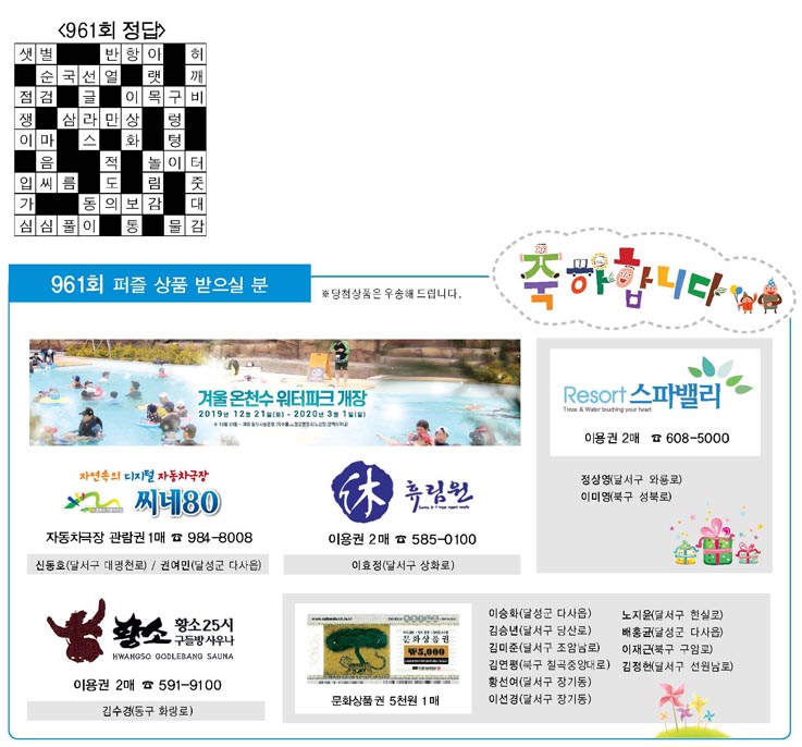 ◑ ‘가족과 함께 풀어보세요’ 낱말퍼즐을 만들어 푸른신문으로 보내주세요. 채택된 분께는 작은 선물을 우송해 드립니다.