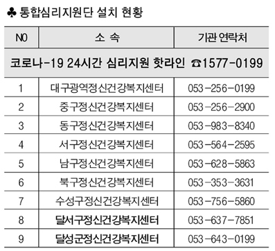 이와 관련해 대구시는 상황이 마무리될 때까지 시민들이 심리안정을 취할 수 있도록 계속 심리상담을 실시할 방침이다.
