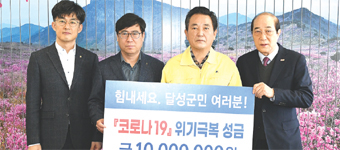 농협달성군지부(지부장 정기호)가 지난 9일 달성군청을 찾아 코로나19 확산방지를 위한 성금 1천만원을 기탁했다. 정기호 농협달성군지부장은“코로나19 확산으로 대구경북지역의 피해가 심각하다. 더 이상의 확산방지와 피해극복을 위한 전 국민적인 노력에 보탬이 되고 싶어 성금을 전달하게 되었다”고 말했다.