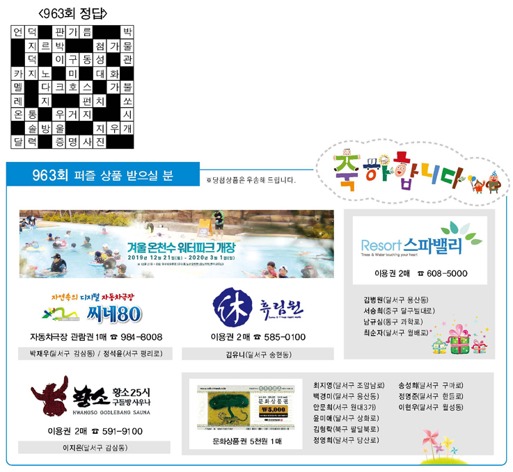♣ ‘가족과 함께 풀어보세요’정답을 아시는 분은 본사 편집부로 보내주시기 바랍니다. 3월 24일까지 도착된 엽서 중에서 추첨을 통해 상품을 드립니다. 주소를 정확히 기재해 주십시오. 당첨상품을 우송해 드립니다.