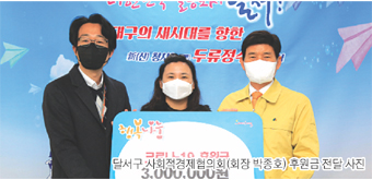 달성새마을금고(이사장 김성택)가 지난 10일 논공읍 행정복지센터를 방문해 논공읍 취약계층의 코로나19 극복을 위해 써 달라며 100만 원 상당의 손세정제 108개를 기탁했다.