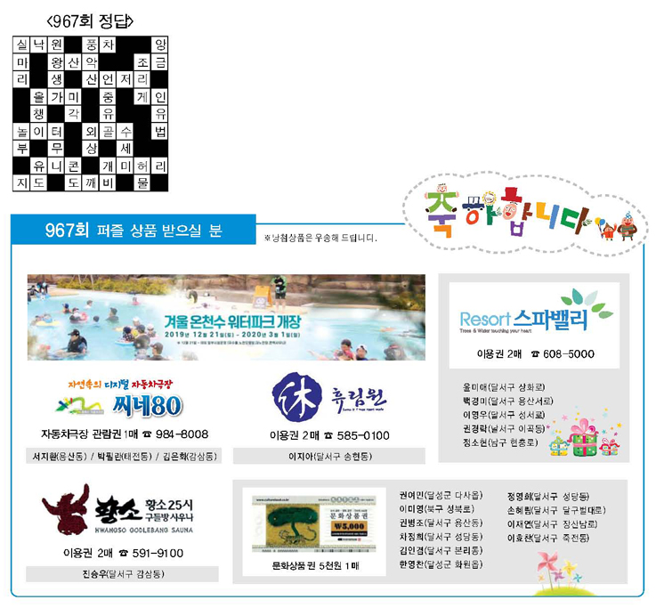 ♣ ‘가족과 함께 풀어보세요’정답을 아시는 분은 본사 편집부로 보내주시기 바랍니다. 4월 21일까지 도착된 엽서 중에서 추첨을 통해 상품을 드립니다. 주소를 정확히 기재해 주십시오. 당첨상품을 우송해 드립니다.