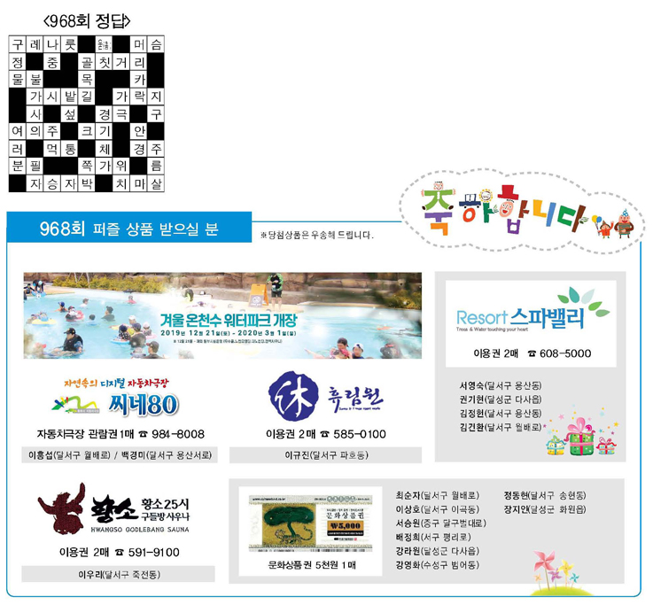◑ ‘가족과 함께 풀어보세요’ 낱말퍼즐을 만들어 푸른신문으로 보내주세요. 채택된 분께는 작은 선물을 우송해 드립니다.