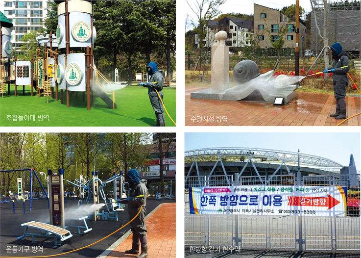 또한, 방송시설이 갖춰진 공원·유원지에는 안내방송을 실시해 시민들 스스로 방역활동의 주체가 될 수 있도록 홍보하고 시민들이 많이 이용하는 운동기구, 벤치, 화장실 등의 시설 방역과 소독 활동을 강화한다.